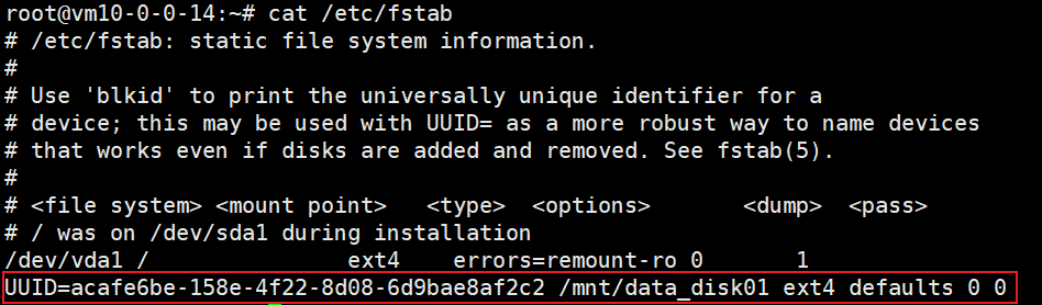 echo 'UUID=acafe6be-158e-4f22-8d08-6d9bae8af2c2 /mnt/data_disk01 ext4 defaults 0 0' >> /etc/fstabecho '/dev/vdb /mnt/data_disk03 ext4 defaults 0 0' >> /etc/fstabcat /etc/fstab command to view the auto-mount configuration.