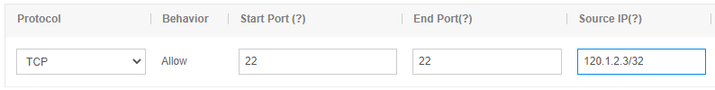 A rule can be configured to allow only specified IP addresses to access the specified port of the KEC instance. For example, the following figure represents that only 120.1.2.3/32 can access port 22 of the KEC instance. You can create such a rule to meet advanced requirements.